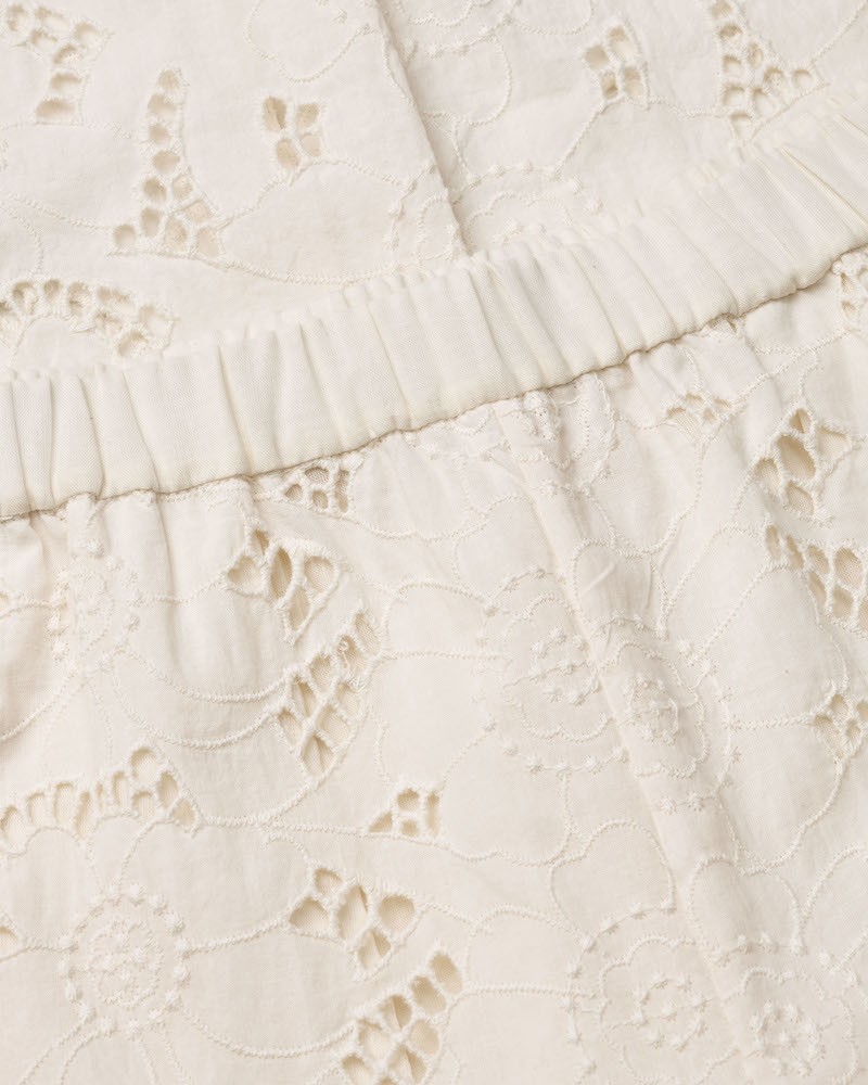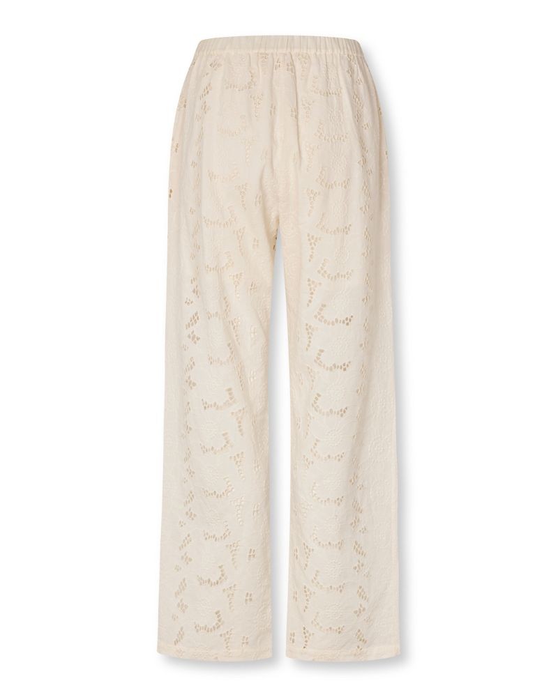 Feminin og elegant buks i ecru bomulds broderi anglaise. Bukserne har elastik i livet, skrålommer og et lige snit med fuld længde. De er foret med ensfarvet bomuld, så de ikke er transparente. Style med den matchende top Sestao for et helt sæt.