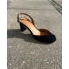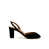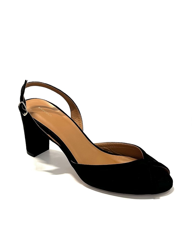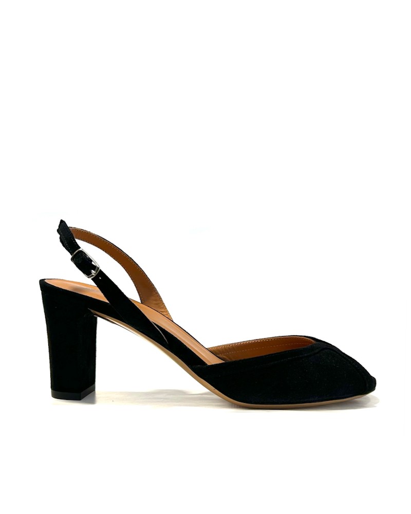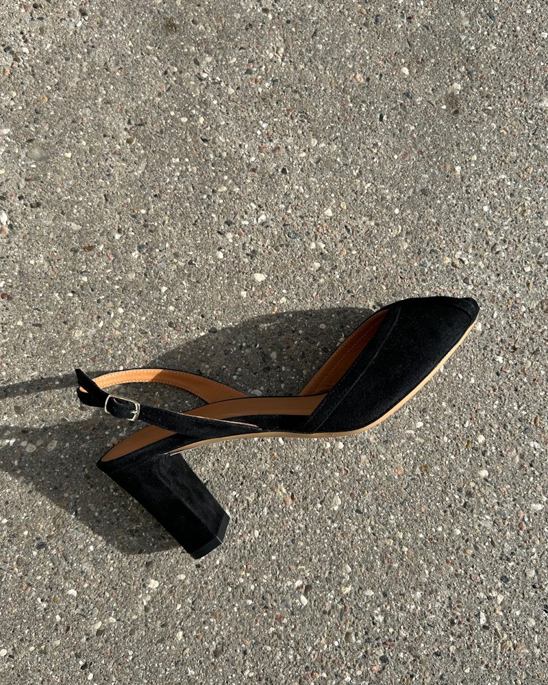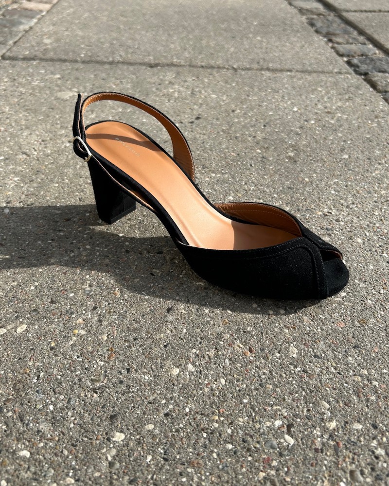 Fine sandaler i sort ruskind med open toe og smal rem bag om hælen. Sandalerne er forarbejdet i sort ruskind, har blødt skind indvendigt og 7 cm høj hæl.