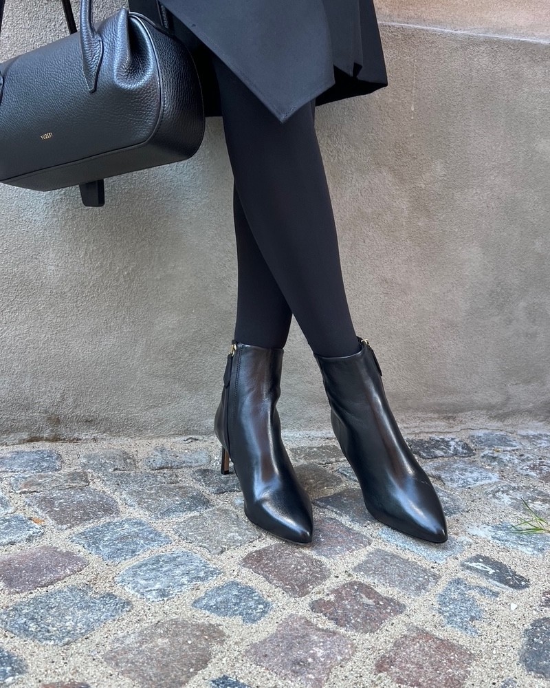 Elegant sort ankel støvle i sort glat skind. Støvlen har spids snude, og en sofistikeret slank hæl på 7 cm. Med lynlås på indersiden, og lædersål. Fremstillet i Portugal.