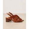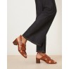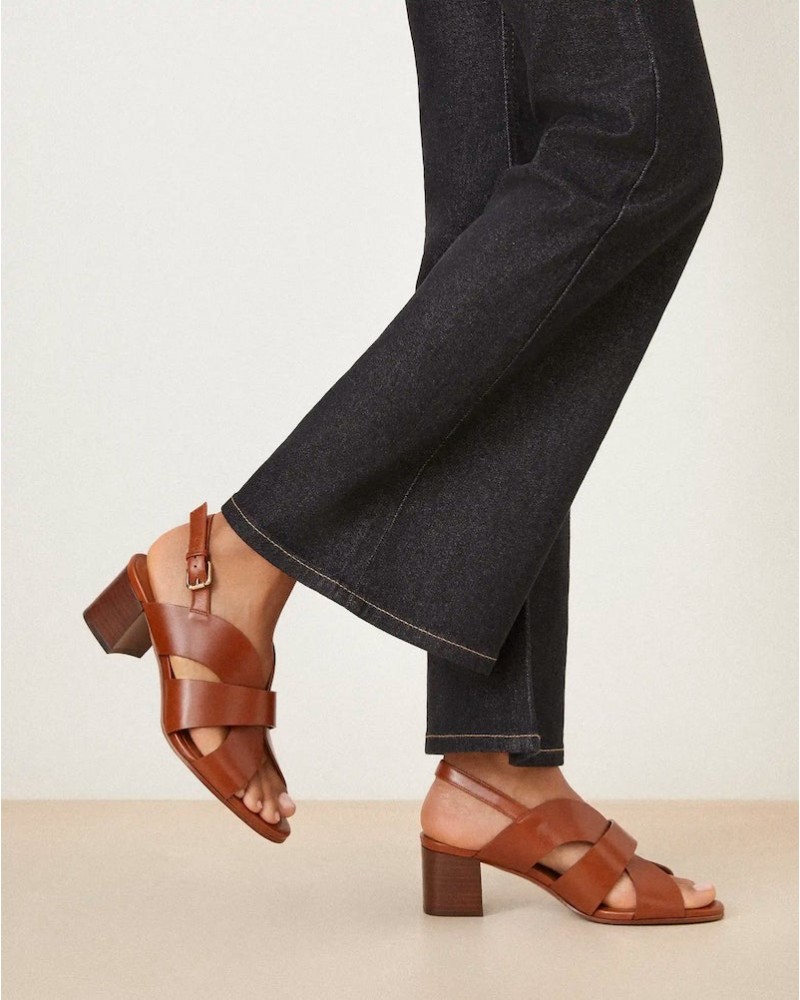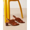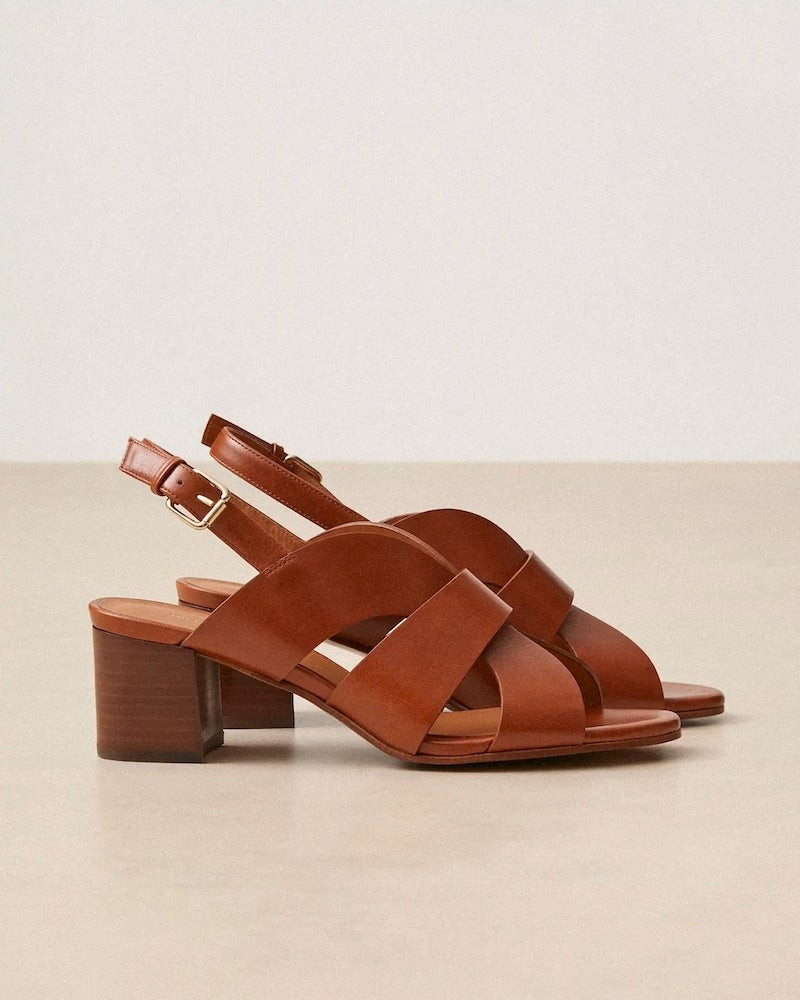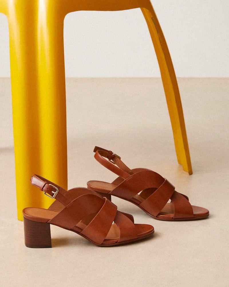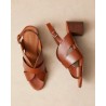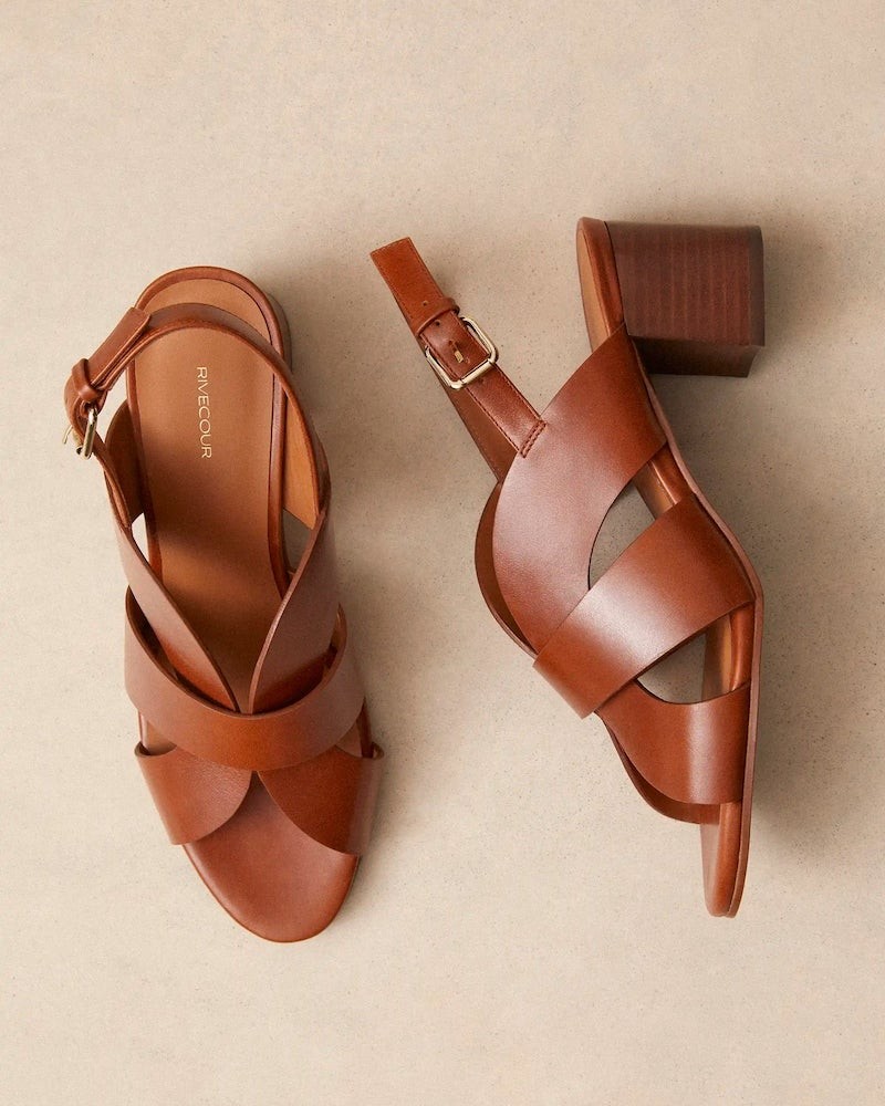 Rivecours ikoniske klassiske sandal lavet i cognac glat skind. Sandalen har open-toe med rem bag om hælen med firkantet spænde med guld finish. Lamineret læder blokhæl på 5 cm.