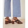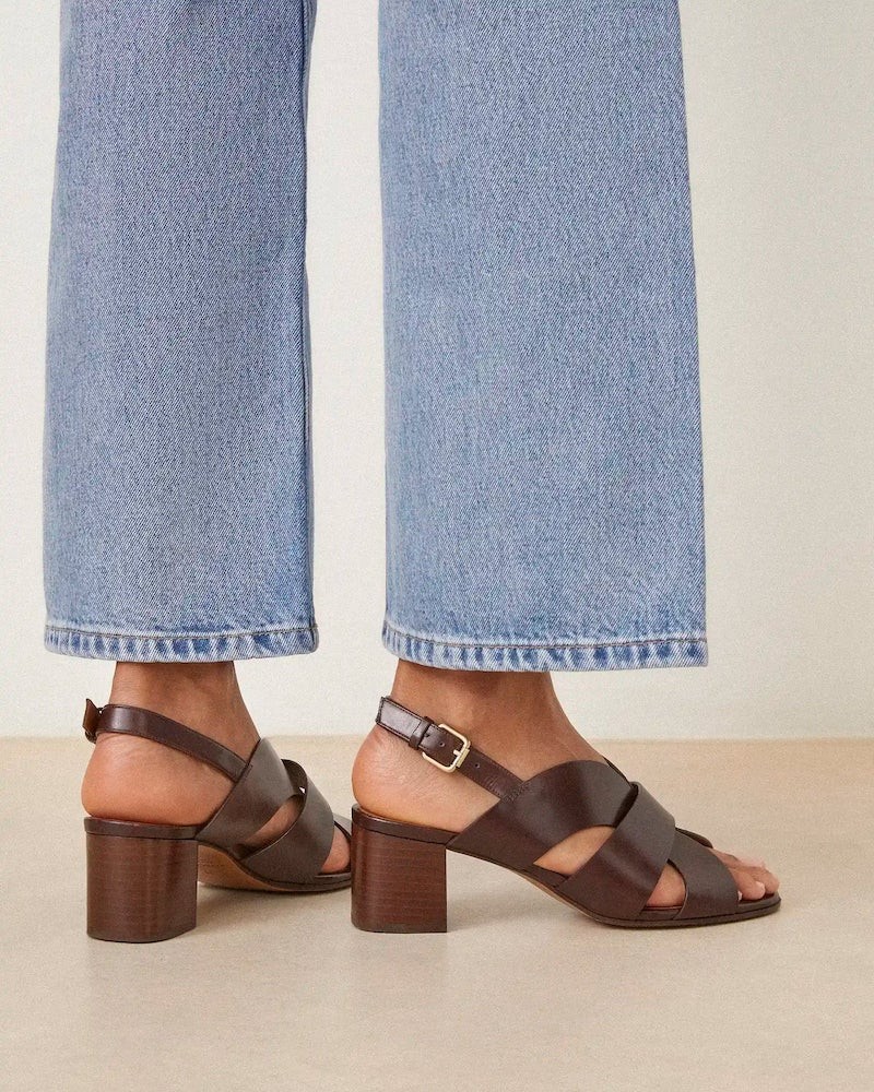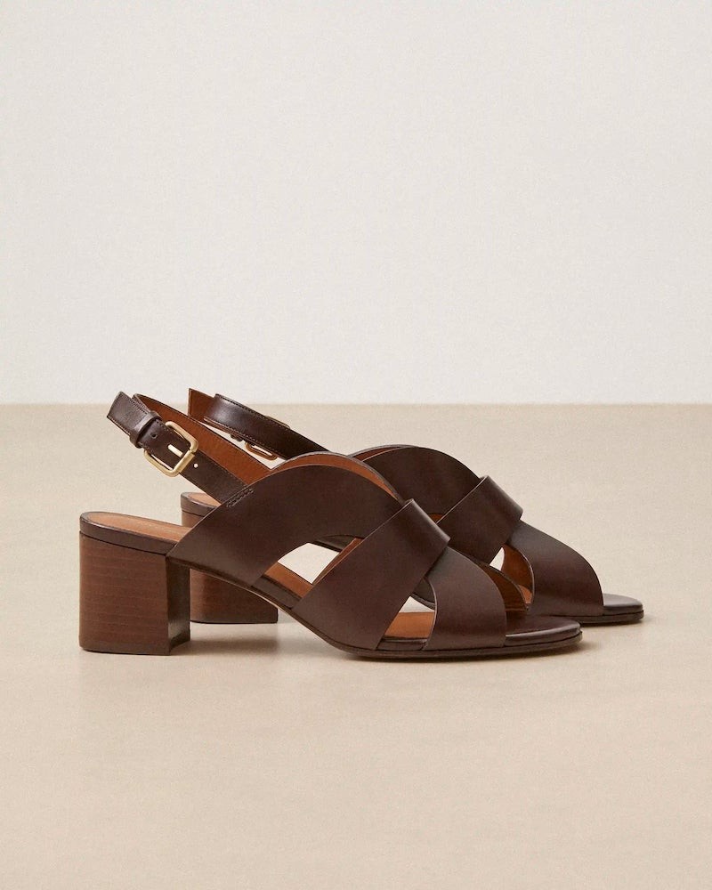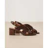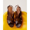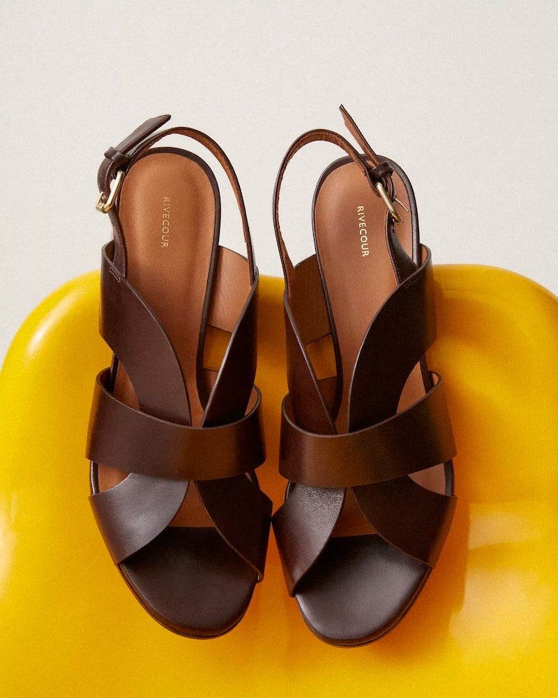 Rivecours ikoniske klassiske sandal lavet i mørkebrun glat skind. Sandalen har open-toe med rem bag om hælen med firkantet spænde med guld finish. Lamineret læder blokhæl på 5 cm.