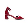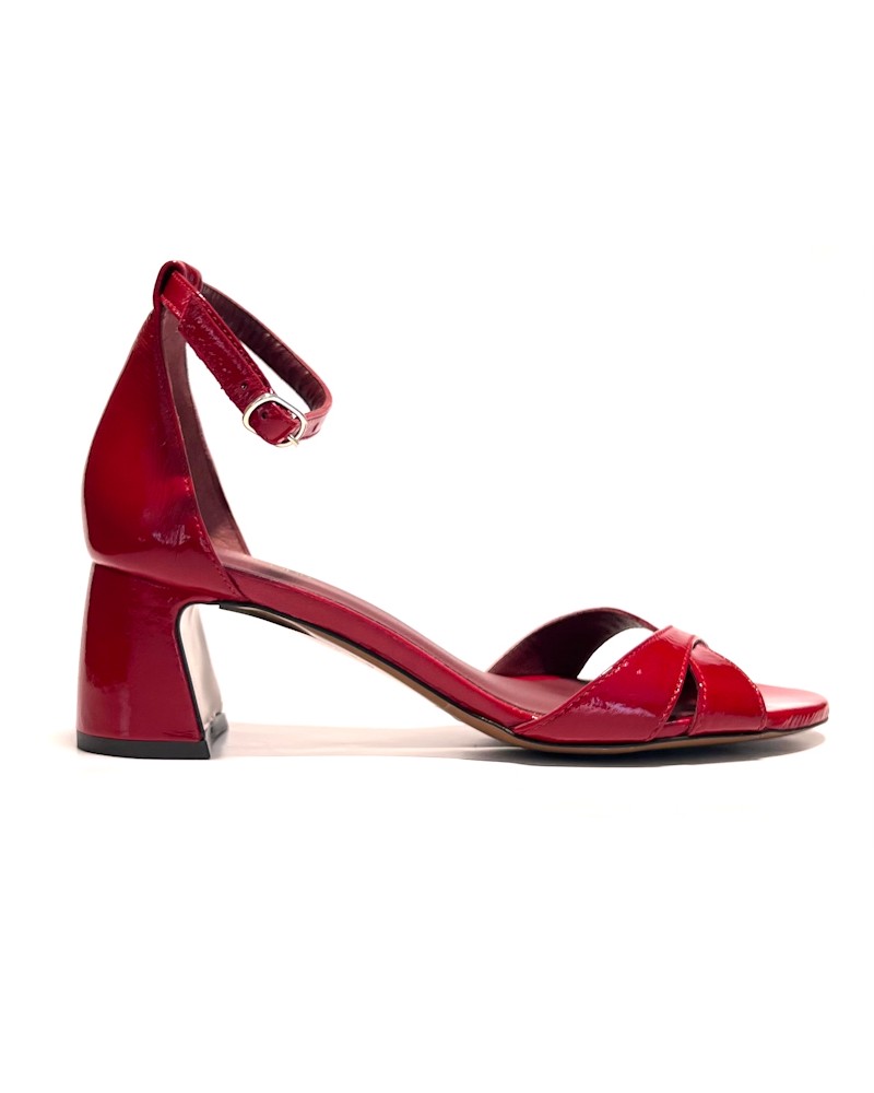 Høj sandal med patenteret rød lakoverflade med elegant rundet open-toe. Sandalen har hælkappe og smal ankelrem med justerbart, guldfarvet spænde. Den har en behagelig blokhæl på 5,5 cm, hvilket gør den velegnet både til hverdag og særlige lejligheder.