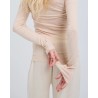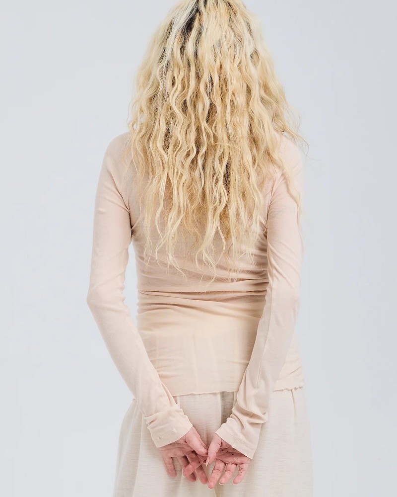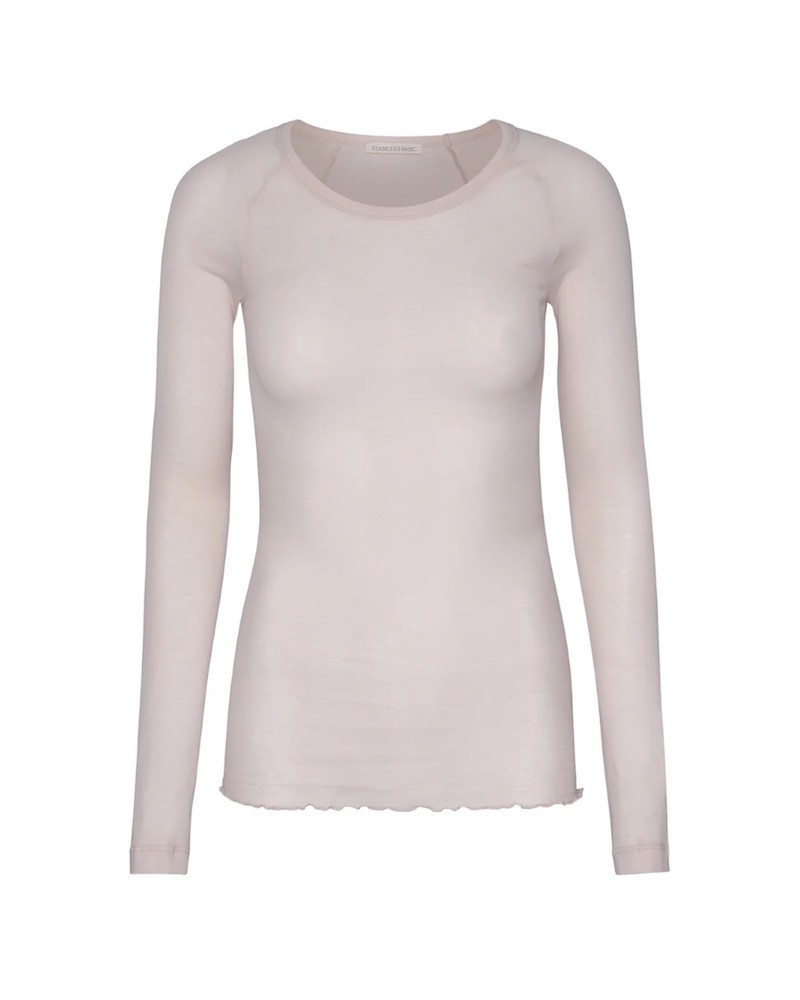 Langærmet t-shirt i rosie beige let og blød bomuld med semi dyb halsudskæring og raglan ærmer. Halsudskæringen er med ribkant og t-shirten har overlockede kanter i bunden. Uden sidesømme og i fin rib af 100% bomuld. Leveres i FSC certificeret papirspose.