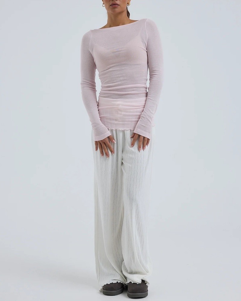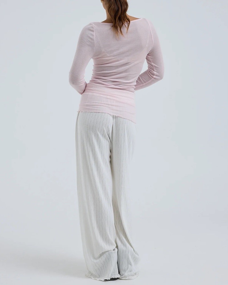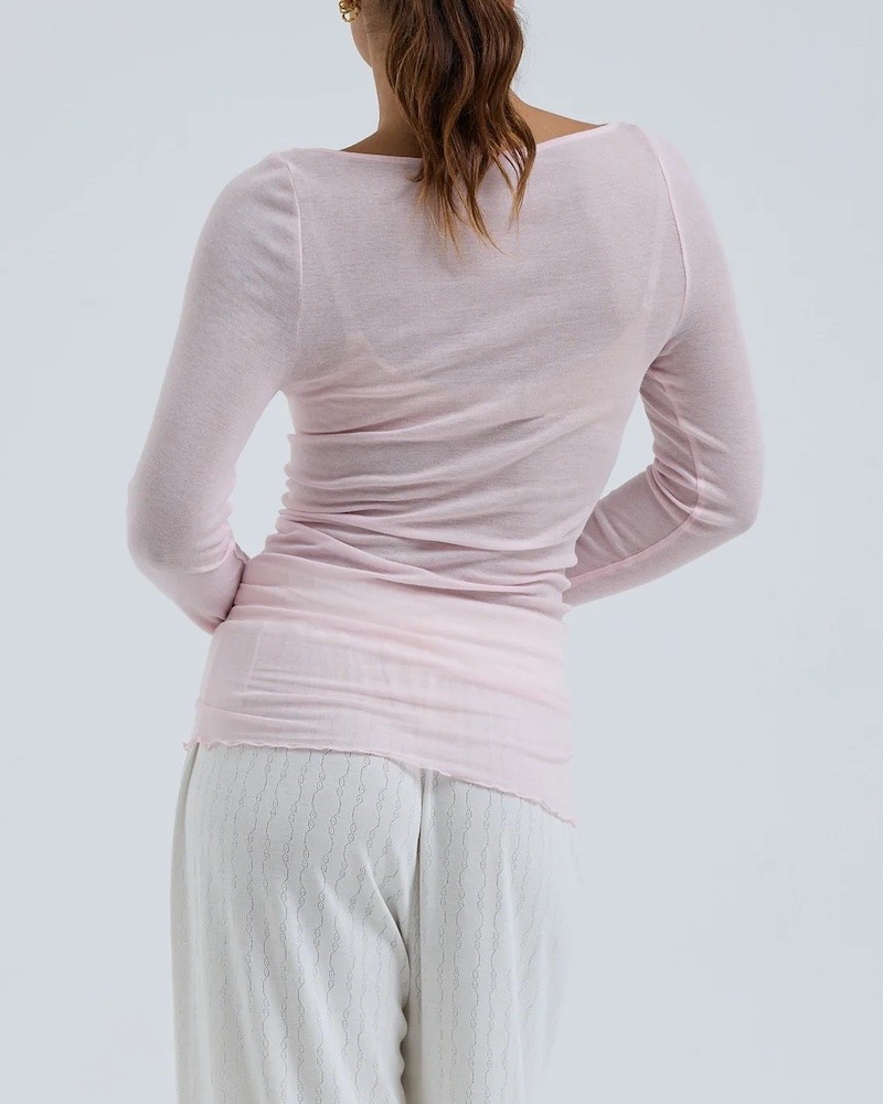 Ny langærmet t-shirt i Pale Rose, lyserød let og blød bomuld med bådformet udskæring. Halsudskæringen er med ribkant og t-shirten har overlockede kanter for neden. Uden sidesømme og i fin rib af 100% bomuld. Leveres i FSC certificeret papirspose.