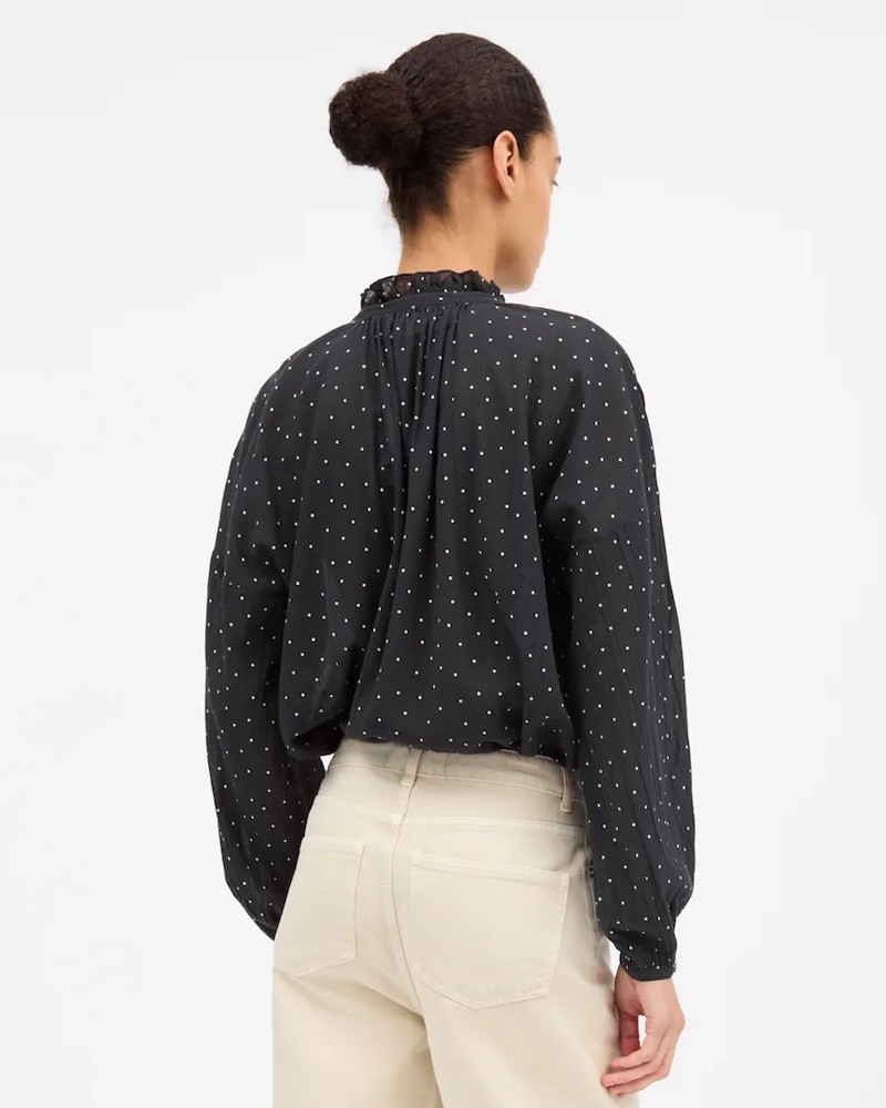 Feminin og elegant skjorte fremstillet i 100% økologisk sort bomuld med hvidt prikket mønster. Hannah skjorten har flæser på kraven, fine rynk og er gennemknappet foran. De sænkede skuldre og let voluminøse ærmer med smalle manchetter giver den et raffineret og afslappet udtryk.