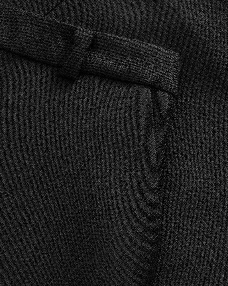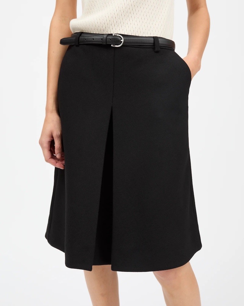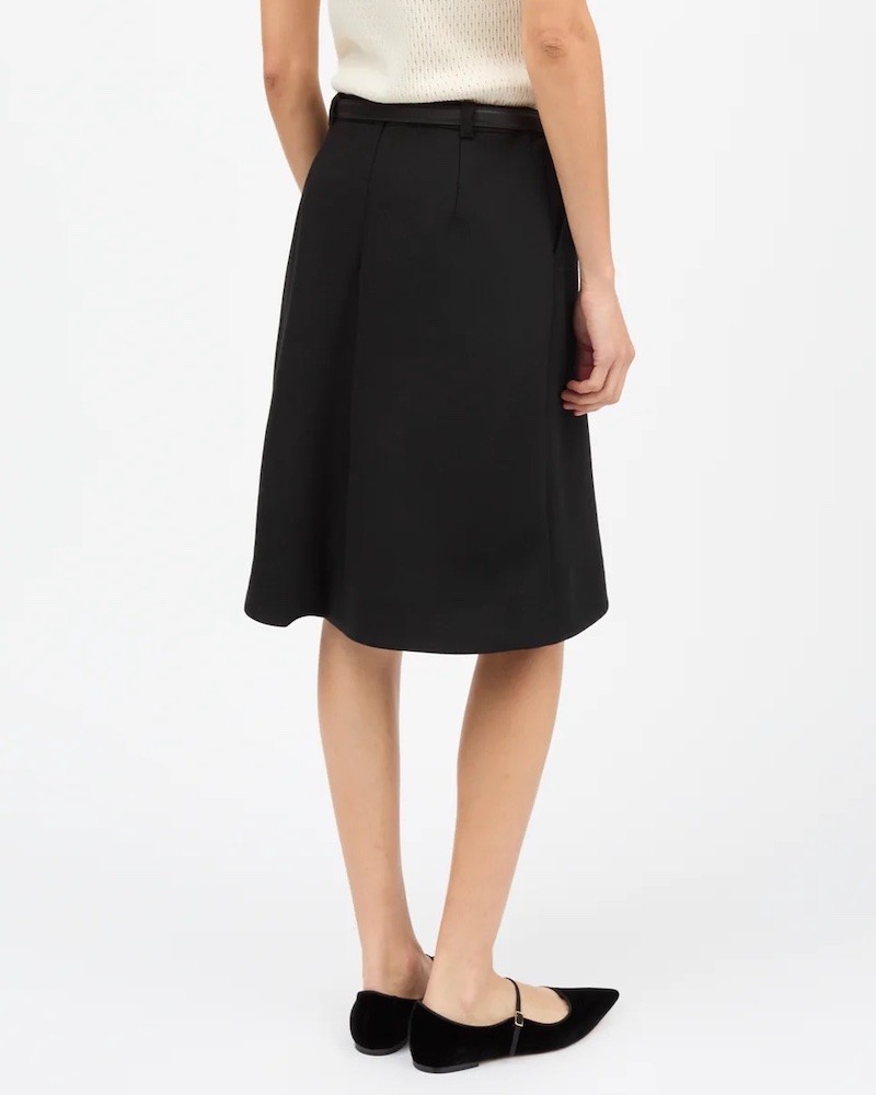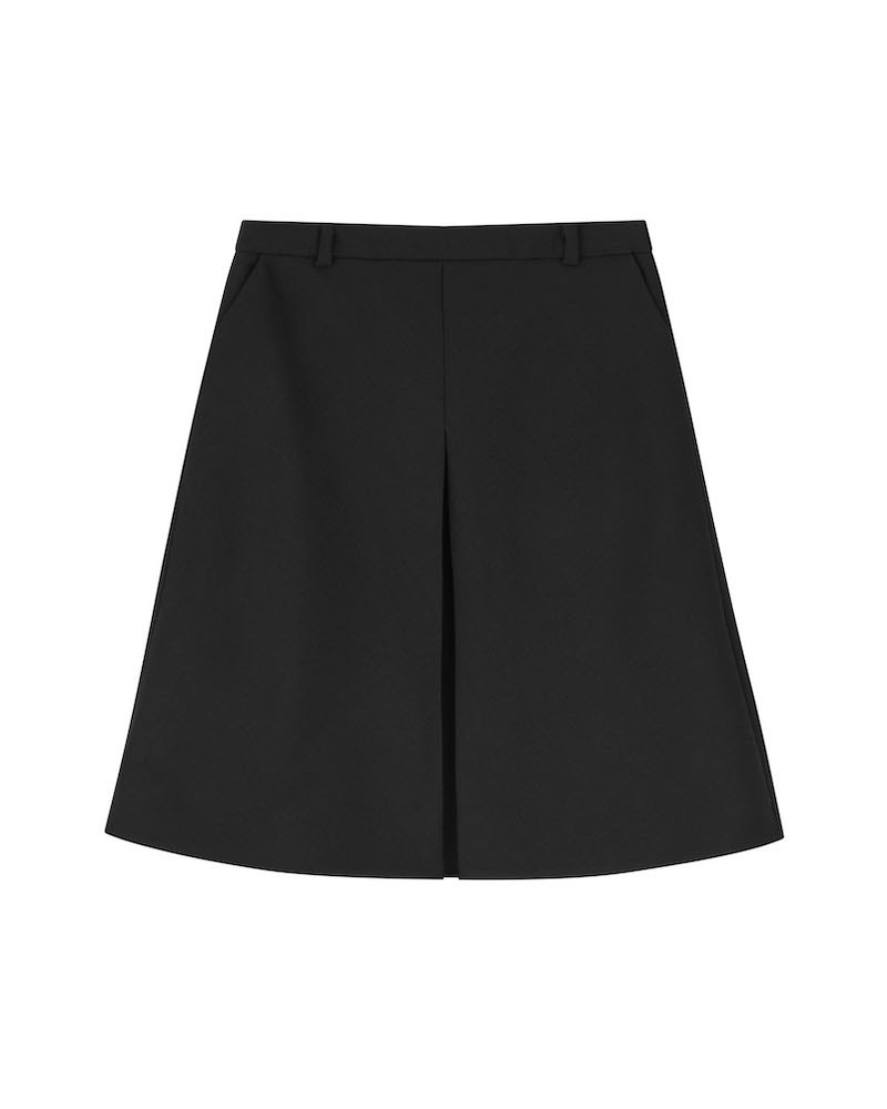 Miles sort nederdel fremstillet i 100% uld. Nederdelen har knælængde, og falder let ud fra hofterne, med et stort indvendigt læg foran, der skaber en blød A-formet silhuet. Nederdelen har sidelommer, bæltestropper og lukkes med skjult lynlås.