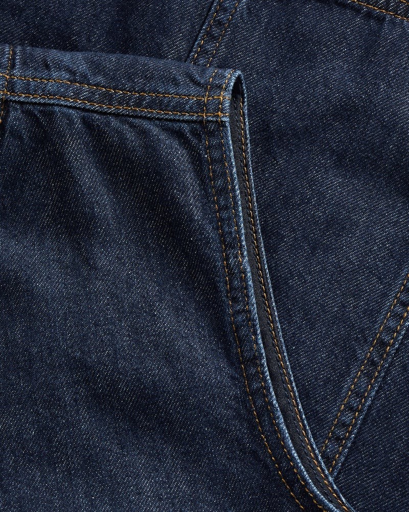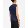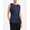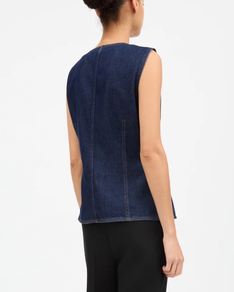 Tammy workwear inspireret vest i blød indigo blå økologisk bomuld. Vesten har rund hals og er uden ærmer. Den er figursyet med dobbeltsyninger, og indsnit der fremhæver pasformen.