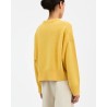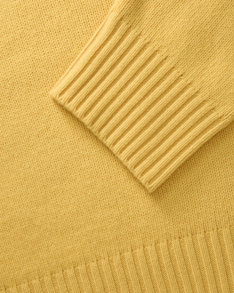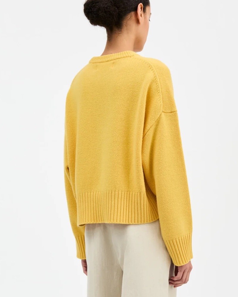 Campa oversize strik i blød gul merinould. Strikken har rund hals med droppede skuldre og en boxy cropped pasform. Designet til at være oversize. Hvis du ønsker et mindre oversize fit, anbefaler vi at gå en størrelse ned.