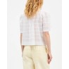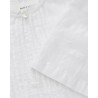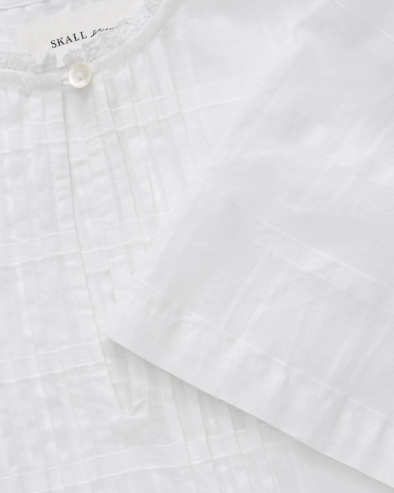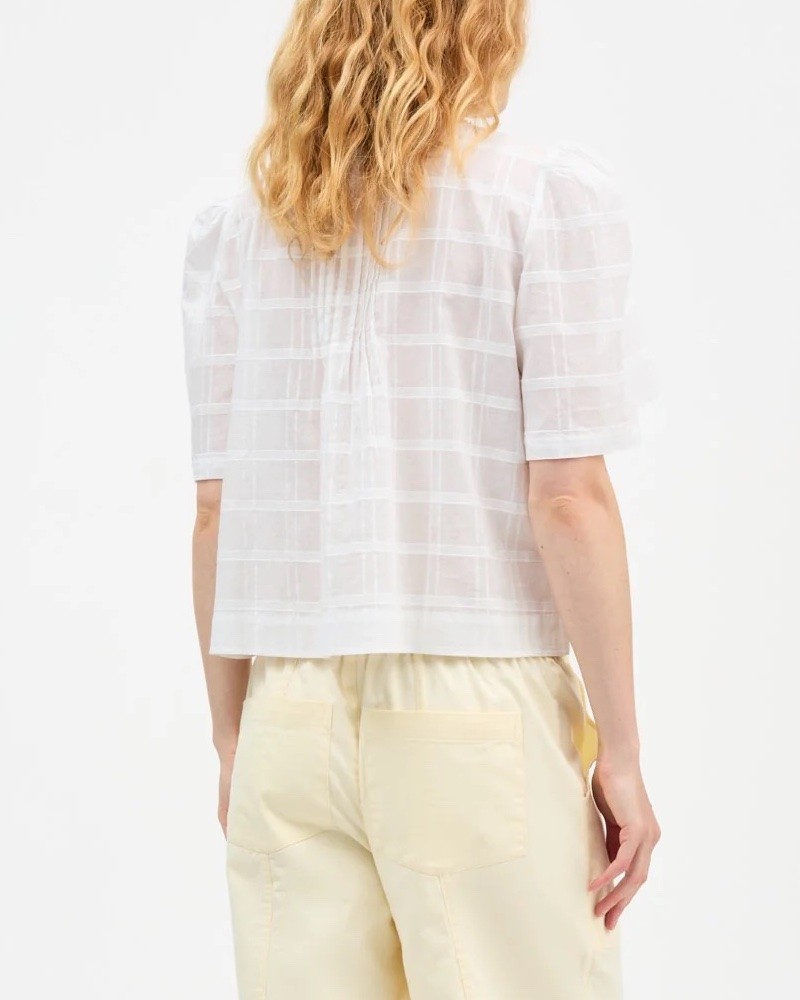 Fiore bluse i hvid økologisk bomuld med fin ternet struktur. Blusen har slidsåbning i halsen med en enkelt knap. Den har halvlange ærmer med vidde og læg både foran og bagpå.