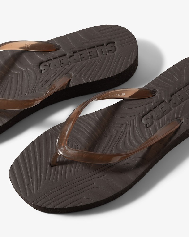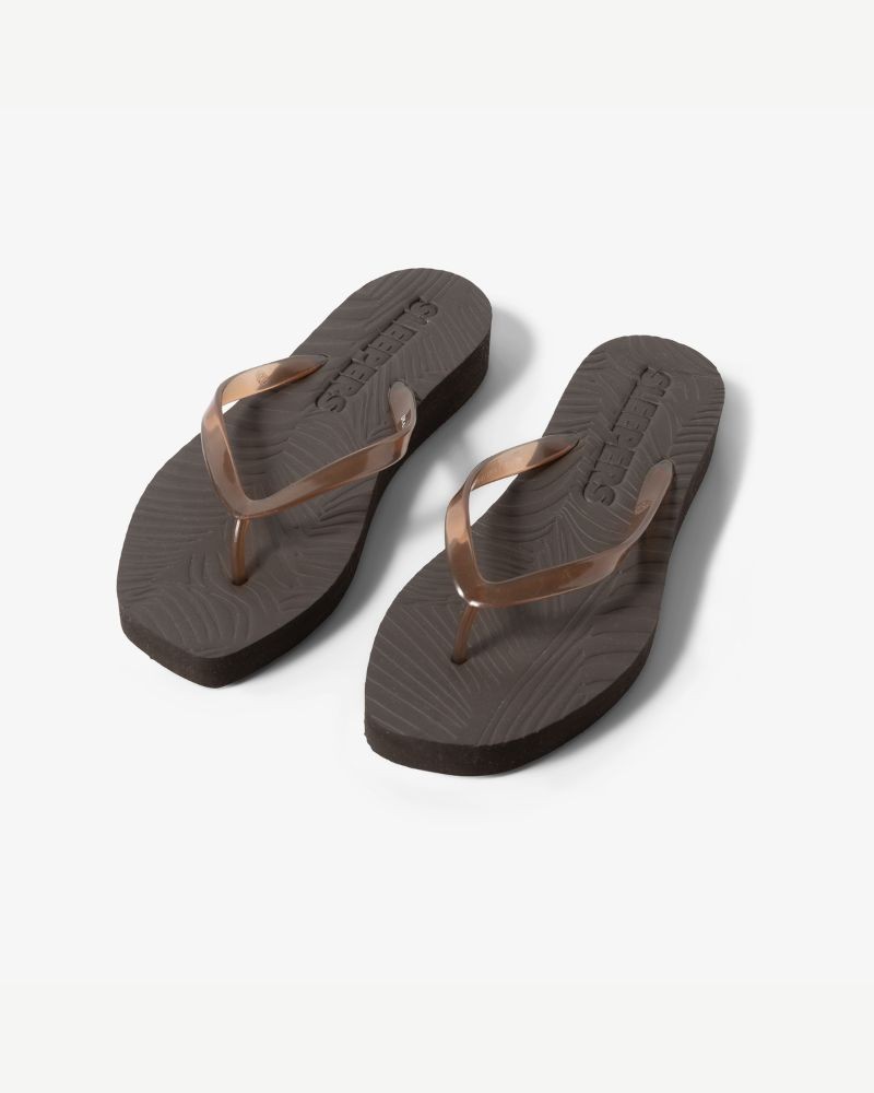 Brune platform flip flop sandaler med transparent strop og en lidt højere sål end den almindelige og fladere model. Tapered platform har samme let kantede snude og er også bæredygtigt produceret af 85% naturligt gummi tappet fra træer på Sri Lanka. Med 15% syntetisk gummi, som er den nødvendige minimumsmængde, for at sikre kvalitet og holdbarhed. Resultatet er bløde, behagelige sandaler, der er let bøjelige, og følger din fods naturlige bevægelser. For at mindske brugen af plastic er de pakket i FSC-certificeret papirpose fremstillet af genbrugspapir.