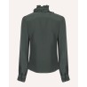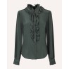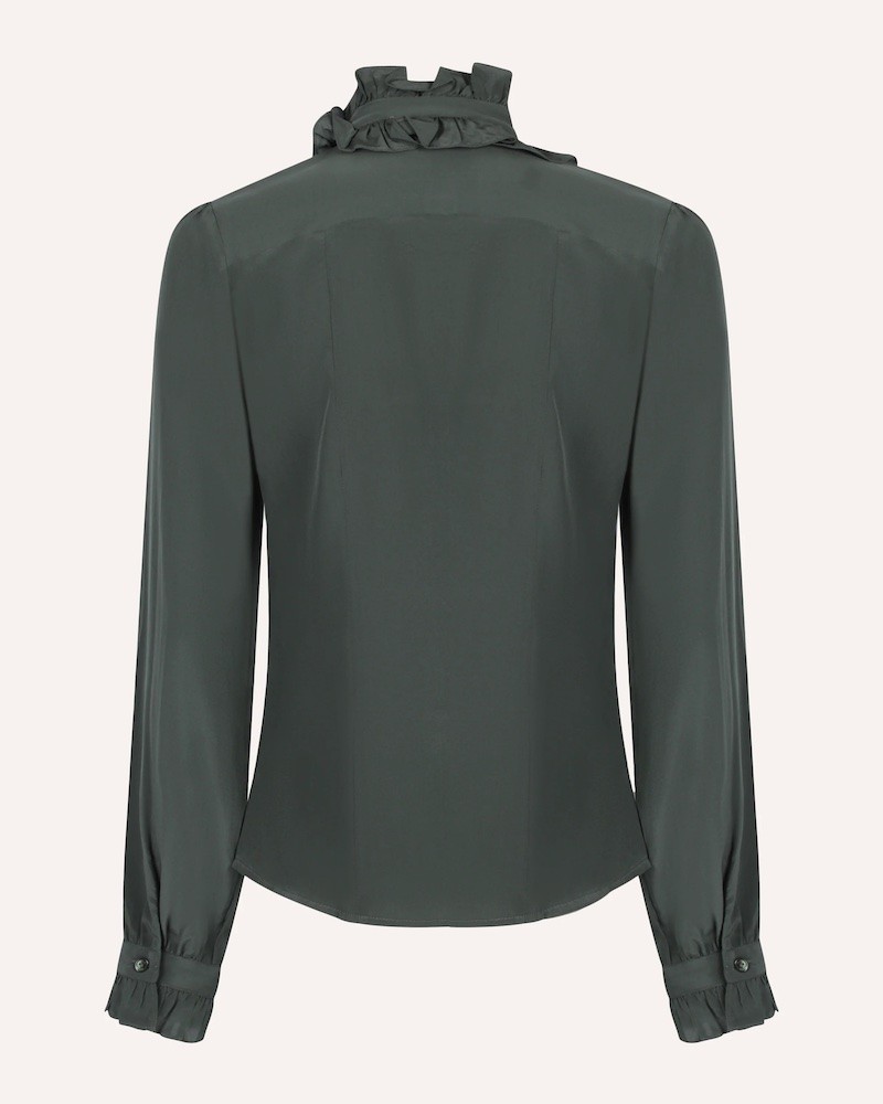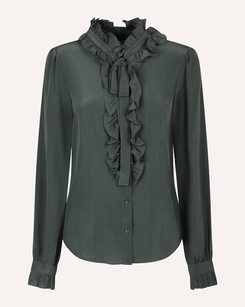Elegant Catroux silkeskjorte i flaskegrøn crepe de chine, en vævning der giver silken en karakteristisk let tekstur med et mat udseende. Catroux skjorten har flæsekrave med bindebånd, og flæser som fortsætter ned midtvejs foran langs knapperne. Den har lange ærmer med flæser og knap ved manchetterne. Bindebåndet kan enten bindes til en feminin sløjfe, eller hænge løst ned foran.