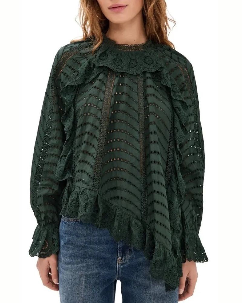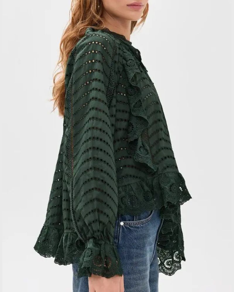 Marcella asymmetrisk skjorte bluse fremstillet i ikke-strækbar bomuld med blondehulmønster detaljer i farven 'cypress', skøn flaskegrøn nuance. Blusen har rund hals med blondekrave, lange ærmer og blonder forneden med asymmetrisk kant. Den har elastiske manchetter med blondekant, og er i en afslappet, men elegant pasform.