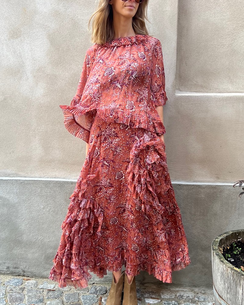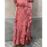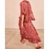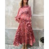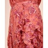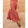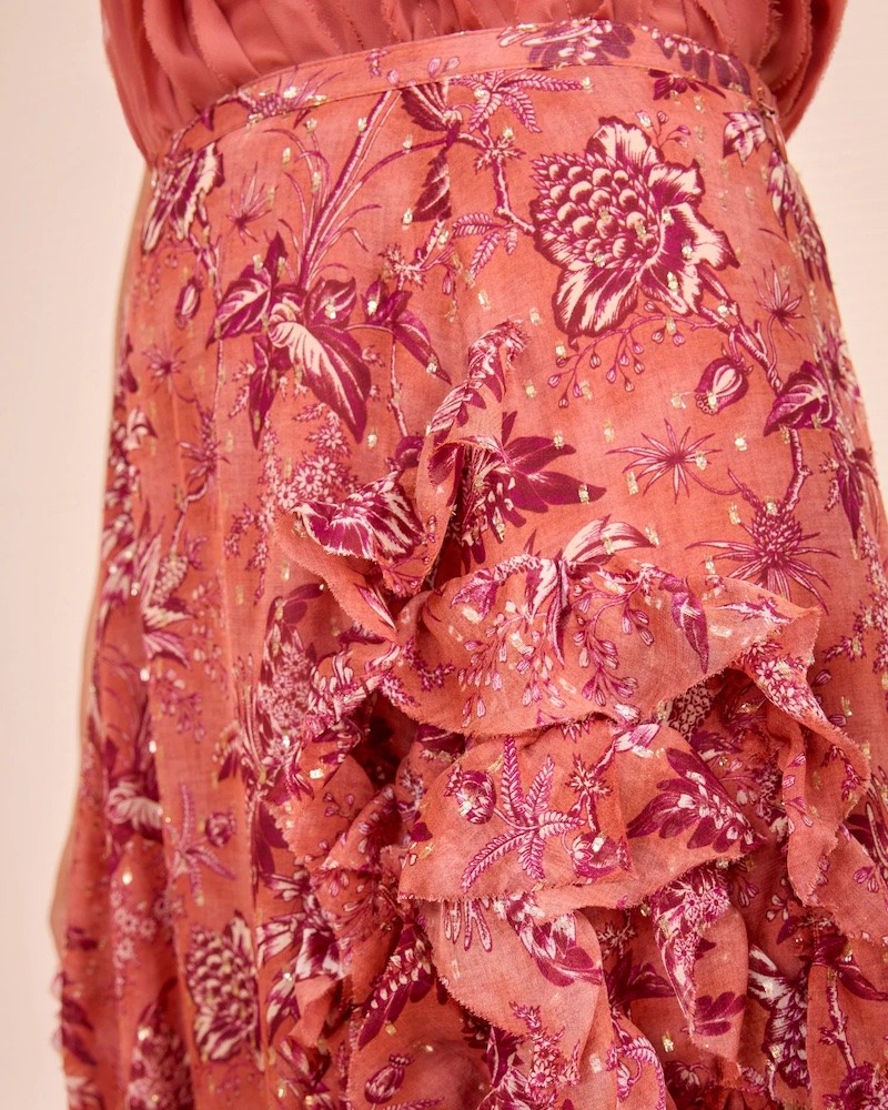 Adele flæse nederdel fremstillet af flagrende silke chiffon i det smukke 'oleander' print med bordeaux palmeblade og flimrende skinnende metalliske prikker på gammelrosa bund. Nederdelen har fast linning, og er designet med en A-formet silhuet med rynkede flæser med rå kanter. Den har fast mellemhøj talje, midi-længde og er foret. Med lommer og skjult lynlås i siden.