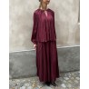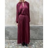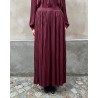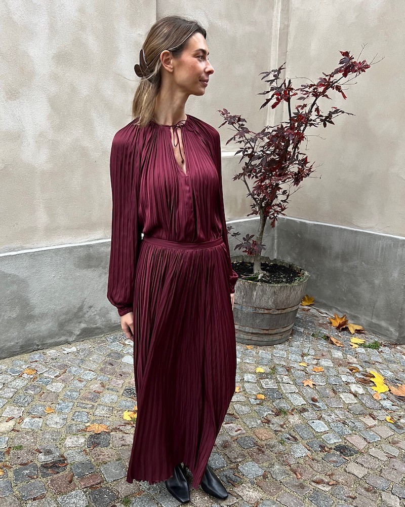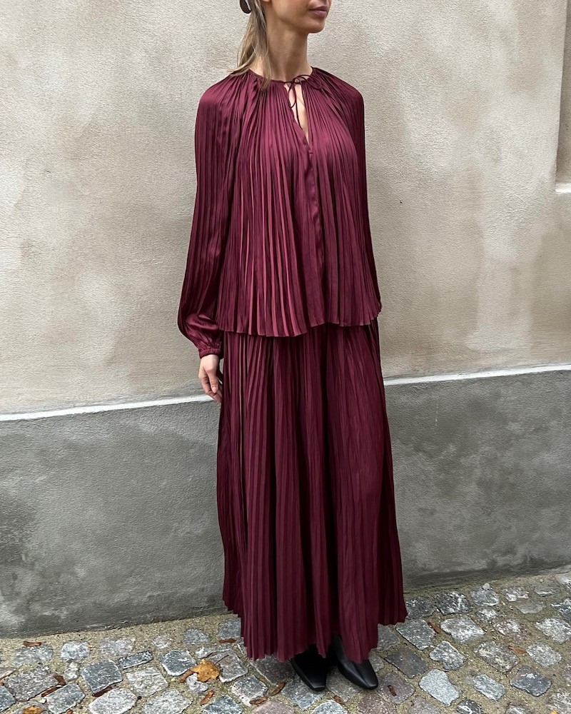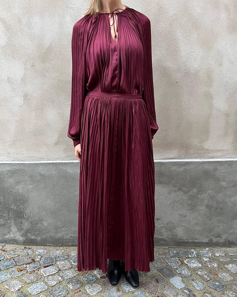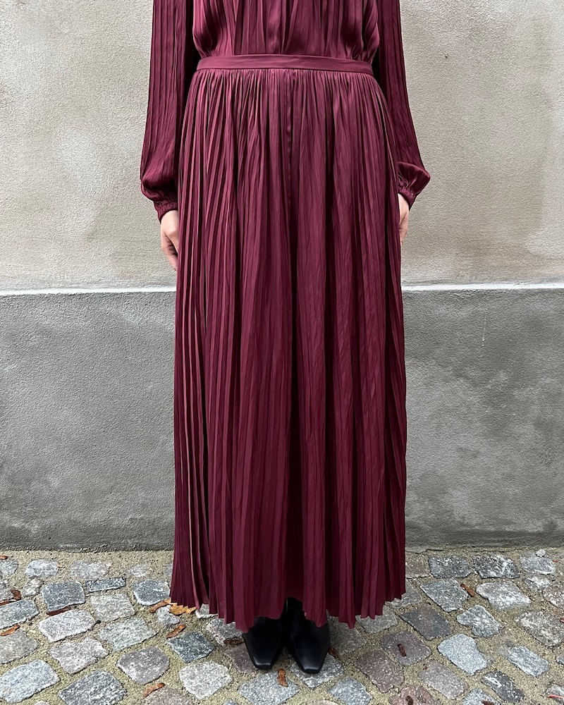 Lulu lang nederdel i plissé satin polyester, som er en af Ulla Johnsons signatur kvaliteter, i fyldig 'claret' bordauxrød. Nederdelen har fast linning, og lukkes med lynlås i siden. Kombiner den med Electra langærmet bluse for et helt sæt.