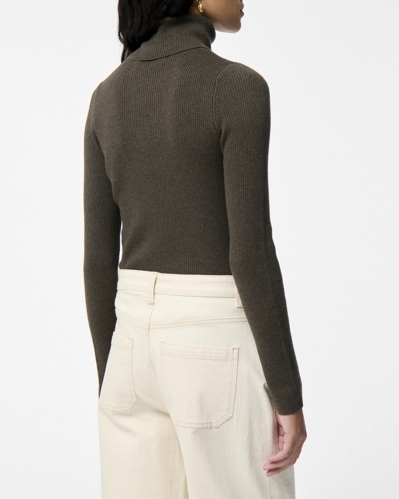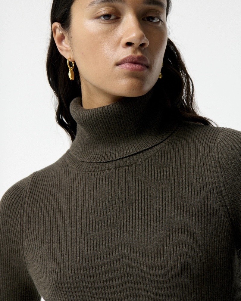 Tætsiddende khaki brun melange ribstrikket klassisk rullekrave med lange ærmer i blød blanding af bomuld og uld. Perfekt alene under en jakke eller som mellemlag, eller under en vest på de køligere dage.