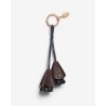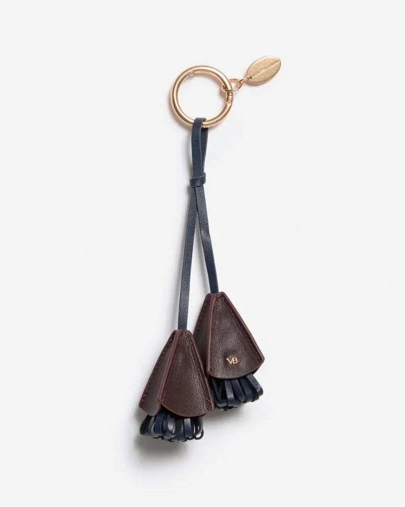 Charm med nøglering og fine blomster kvaster i mørkebrun og marine kalveskind. Med guldfarvet hardware og diskret VB logo. Kan bruges både som nøglering og som fin blomster accessory på dine tasker.