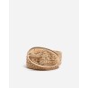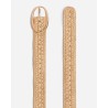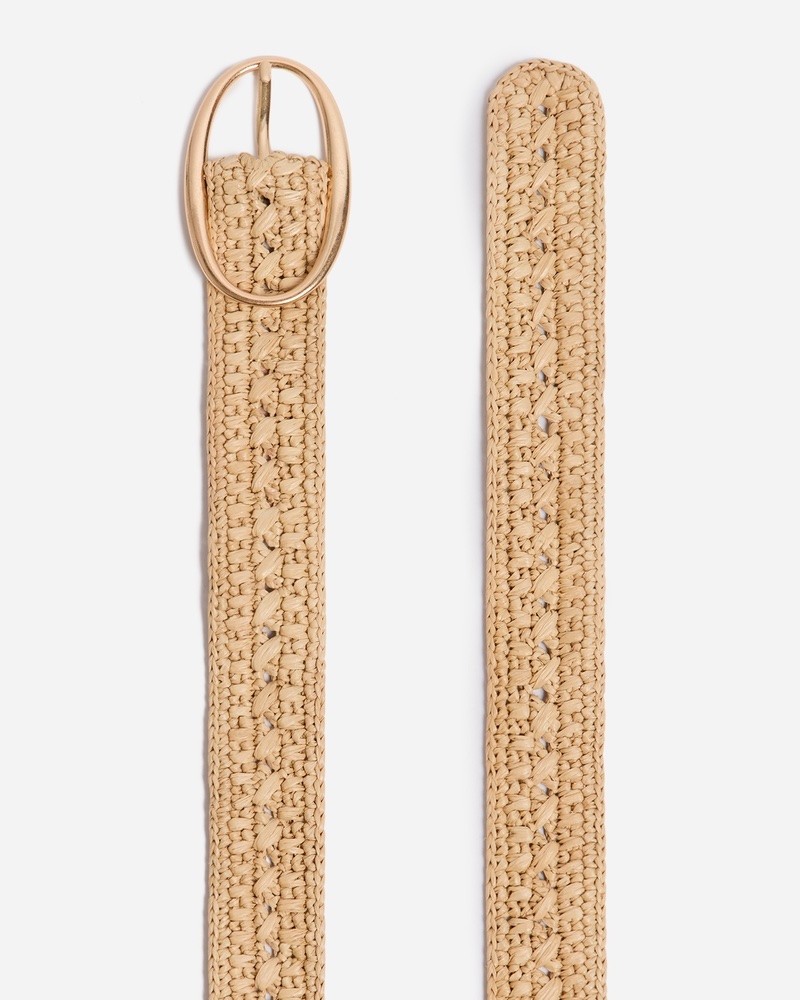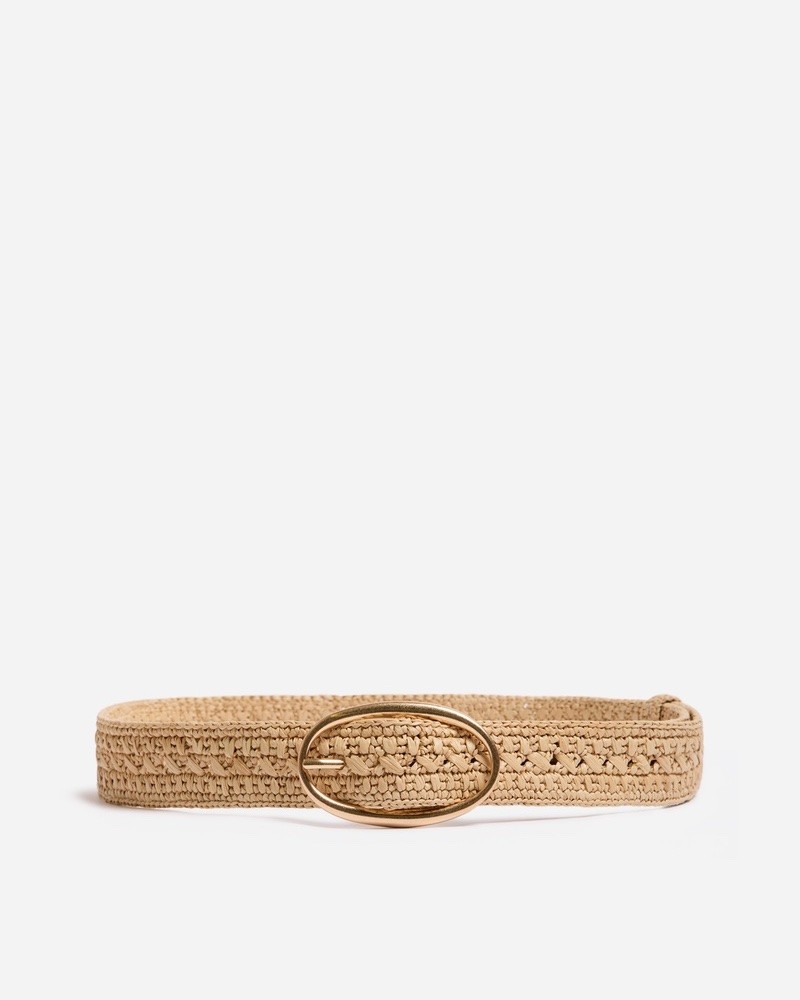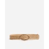 Flettet bælte i naturel raffia med ovalt guldfarvet spænde.