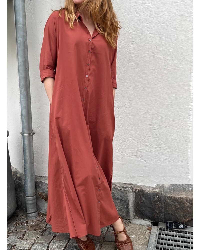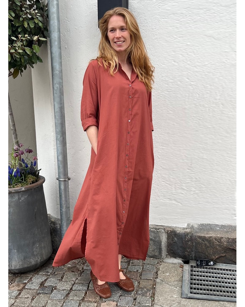 Boden skjortekjole i rustfarvet let vævet bomuldspoplin. Boden kjolen har hentet sin inspiration fra den populære Beau shirt, og er en skræddersyet skjortekjole med klassisk krave, lange ærmer og knaplukning foran. Den har lommer i sidesømmen, og slidser i siden. Style den med et bælte, eller brug den casual og afslappet som den er.